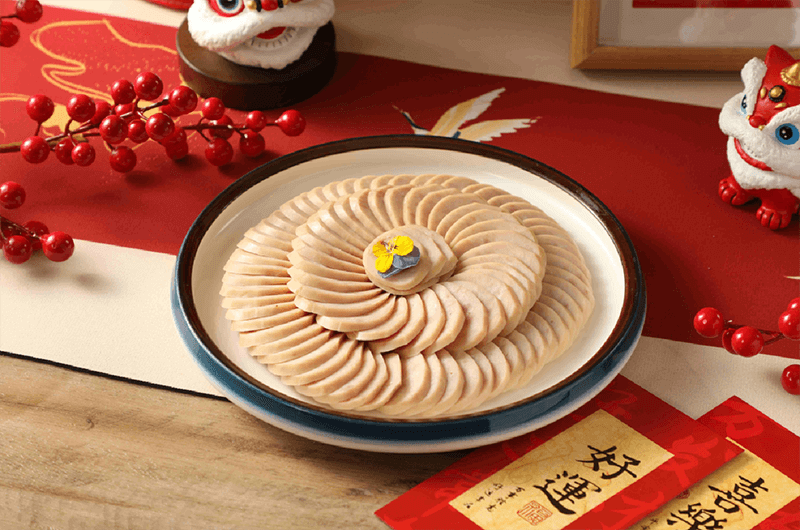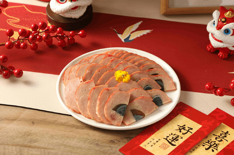 剔骨后以秘制老汤卤制入味,再均匀镶嵌整块松花蛋,卷紧定型后二次卤浸。肉质咸香细腻,松花蛋风味独特,口感层次分明。