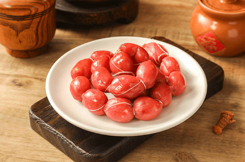 以传统配方调味,手工灌制成均匀小巧的枣状,经低温风干与古法烘烤而成。口感紧实弹韧,咸甜适中,风味醇厚独特。
