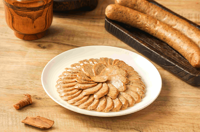拌入足量现磨黑胡椒颗粒及天然香料,灌入天然肠衣后,经低温风干与古法熏制而成。肉质紧实,胡椒辛香浓郁,风味独特。